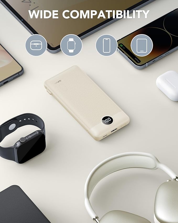 - [High Capacity & Universal Compatibility] Boasting a 10,000mAh capacity, this USB-C portable charger can power your devices 2.5 to 4 times on a single charge, depending on the device. It's compatible with iPhones, Android devices, and most USB-C enabled gadgets using the built-in cables.