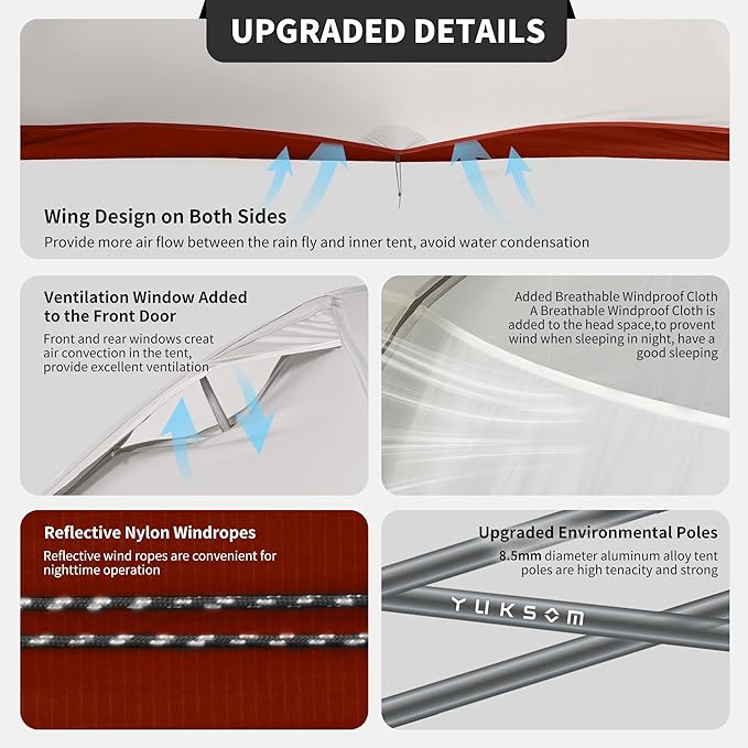 • 2024 NEW CLOUD UP PRO: The Cloud up Pro is the upgraded version of Cloud up 2 Person Tent; 1. A ventilation window is added above the front door, to provide more air flow in the tent, avoid water condensation; 2. The door is upgraded to be a larger and higher front door, with more space to put your camping gears and easy access to the tent.