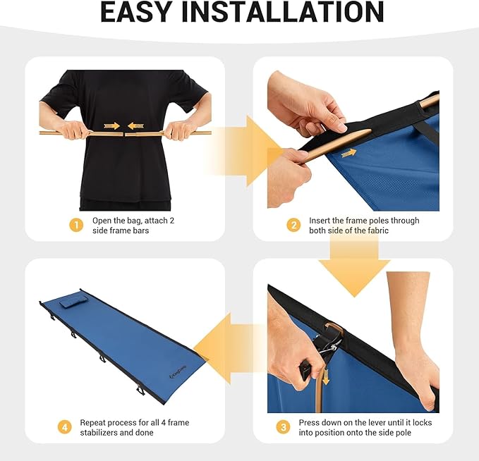 - Enhanced Comfort & Convenience: Equipped with a pillow pocket for added comfort, the cot also features an elastic strap design on the back, allowing you to securely fix an air mattress for extra cushioning. The dual-zipper outer bag is easy to use and ensures your gear stays secure while you rest.