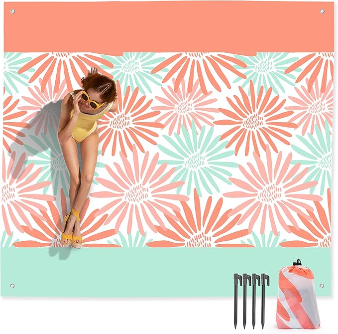- Waterproof and Sandproof Beach Blanket: Crafted from high quality polyester fiber, this beach blanket comes with 4 corner loops and durable ABS anchors stakes, offering waterproof, windproof, and sandproof capabilities for enjoying sunny beach days.