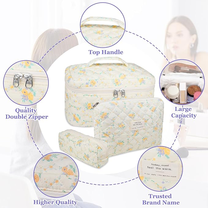 Makeup Bag Set, Quilted Makeup Bag, Large Floral Cosmetic Bag for Women, Cute Cotton Makeup Bag, Flower Travel Toiletry Organizer Bag (Yellow Daylily)