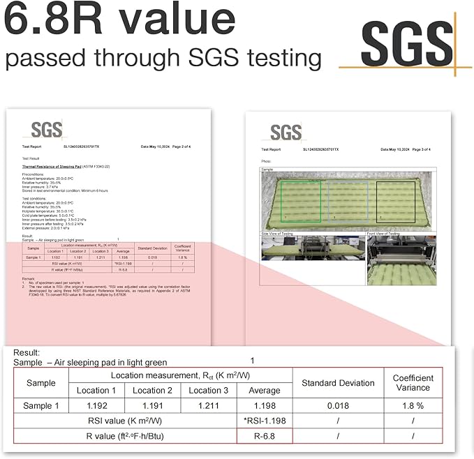 - 【SGS Certified High R-value】The Camdoor camping sleeping pad is SGS professionally tested and certified with a high R-value of 6.8. 3.93” Horizontal Insulating air Chambers will effectively distribute your weight on the sleeping pad camping while preventing the ground from sucking the heat out of your body, Keeps you warm in extreme weather, which makes Camdoor sleeping pad backpacking suitable for 4 season.