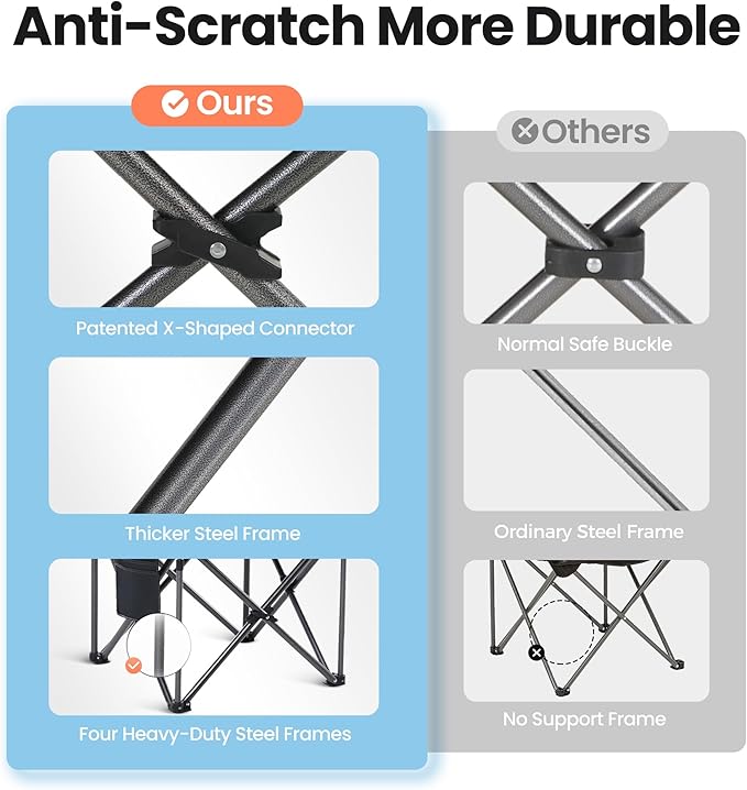 - 【Sturdy Material】: This camping chair has hammer tone powder coating that can prevent corrosion and fading. Four heavy-duty steel frame was added to the bottom of the folding chair and enforce stability. Sturdy steel frame construction make it can support up to 450lbs/200kg.The 600D Oxford fabric is resistant to tears and abrasions, ensuring that this camping chair will last for years to come.