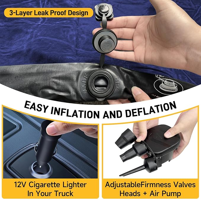 - High-Quality Materials: Our inflatable truck bed air mattress features a plush soft-flocked top surface, durable PVC construction for robust support, and upgraded 2024 extra-thick 210T grid fabric on the bottom to prevent punctures and air leakage, enhancing durability and reliability.