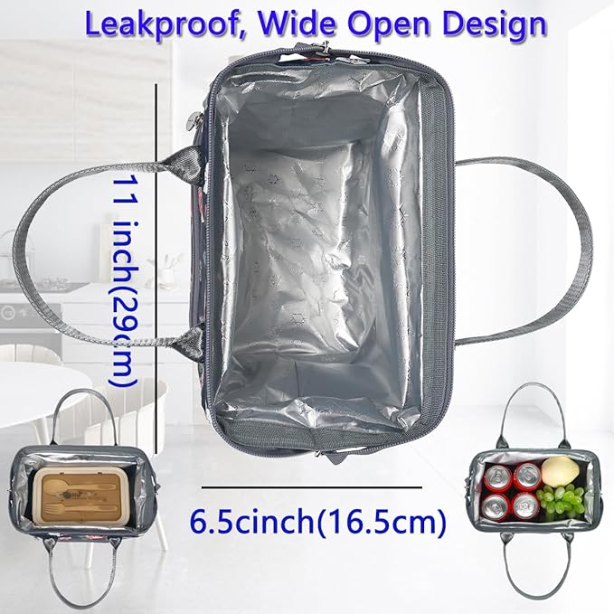 - ✿ Wide-Open Design & Large Size: Our women bag can be opened up to 11"L x 6.5"W by dual zipper closure, you can put into or take out of your lunch or other kinds of stuff horizontally, avoid spilling soup or liquid in the bag. The dimension is:11” L×6.5” W×11” H,it could give roomy storage space you need to hold your favorite meals, delis, and lunch treat. You could fill the compartments or pockets with lunch boxes, food containers, condiments, fruit salad bowls and other essentials.