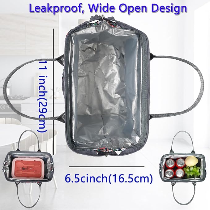- ✿ Wide-Open Design & Large Size: Our women bag can be opened up to 11"L x 6.5"W by dual zipper closure, you can put into or take out of your lunch or other kinds of stuff horizontally, avoid spilling soup or liquid in the bag. The dimension is:11” L×6.5” W×11” H,it could give roomy storage space you need to hold your favorite meals, delis, and lunch treat. You could fill the compartments or pockets with lunch boxes, food containers, condiments, fruit salad bowls and other essentials.