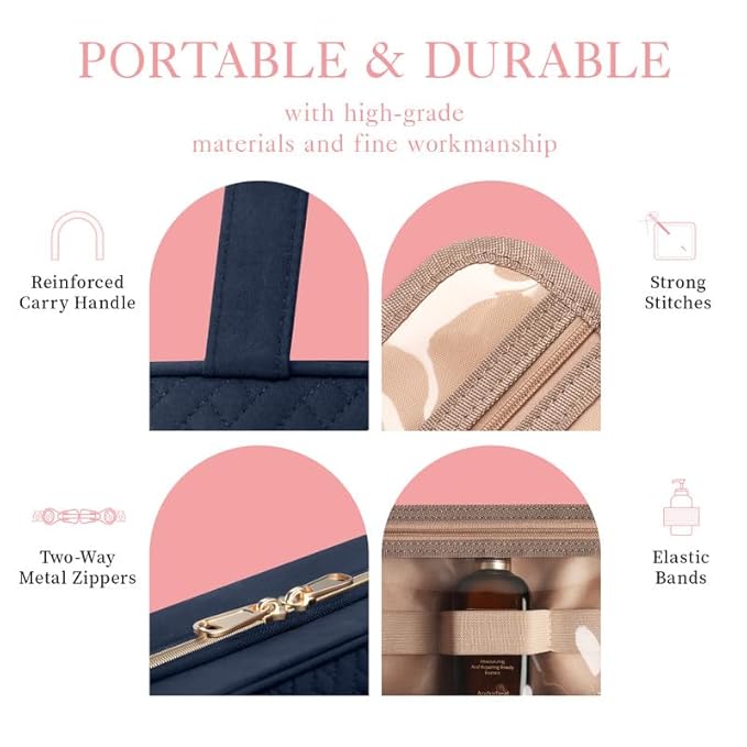 - USER-FRIENDLY DESIGNS: Designed with user convenience in mind, this travel bag for toiletries incorporates supporting pads to maintain its shape and provide excellent protection for the items inside. Elastic straps keep toiletry bottles upright, preventing liquids from escaping and causing a mess. The reinforced zippers enhance durability and ensure smooth opening, adding to the overall user-friendly experience.
