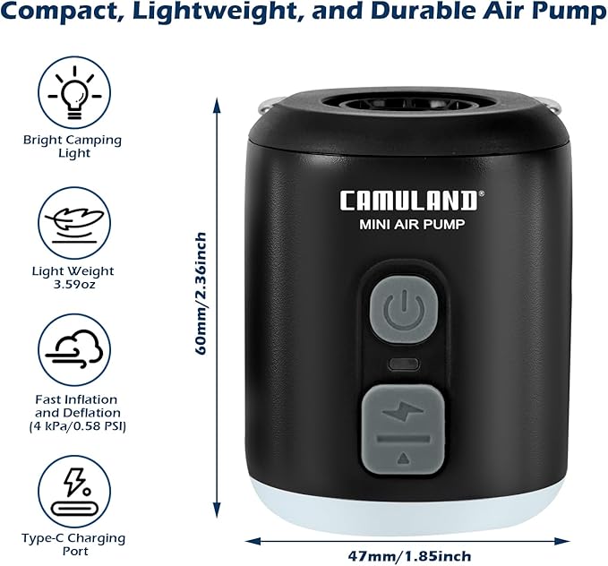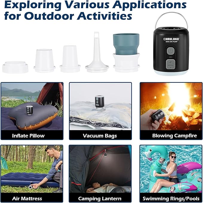 CAMULAND Mini Air Pump with Magnetic Design Camping Lantern Electric Pump for Inflatables with 1400mAh Battery Rechargeable for Air Mattress, Pool Floats,Vacuum Storage Bag