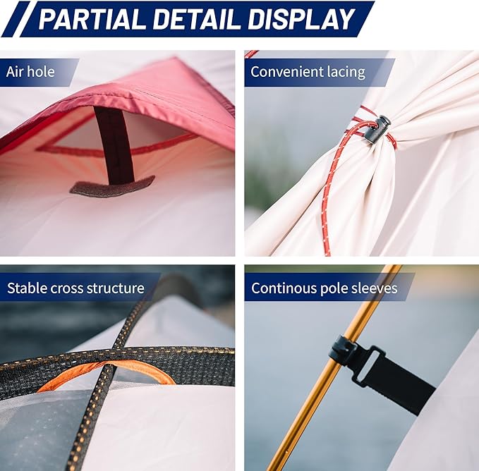 • 【Durable Quality】 The tent is designed for mountain hiking enthusiasts, rainproof, tear-proof, breathable, warm; wind-resistant and stable. Bracket through the tube design, strong wind resistance. The outer tent is tear-proof fabric, strong and durable. Tent stakes are aluminum 6 angle shape, more solid than ordinary ones.