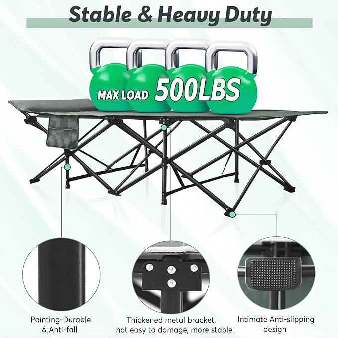 - Durable and Long-lasting--The upgraded version of the cot bed is made of double layer 600D Oxford cloth, designed with 10 tubular iron legs and 25mm thick square tubes to provide stability, featuring superb strength, supporting a max capacity of 500 pounds.