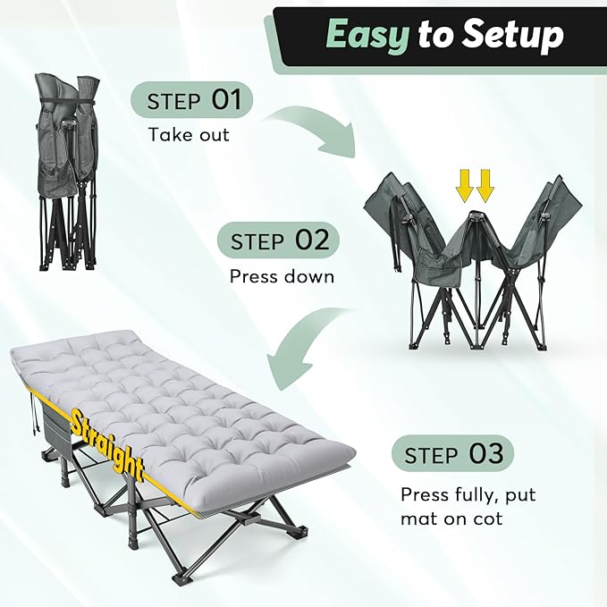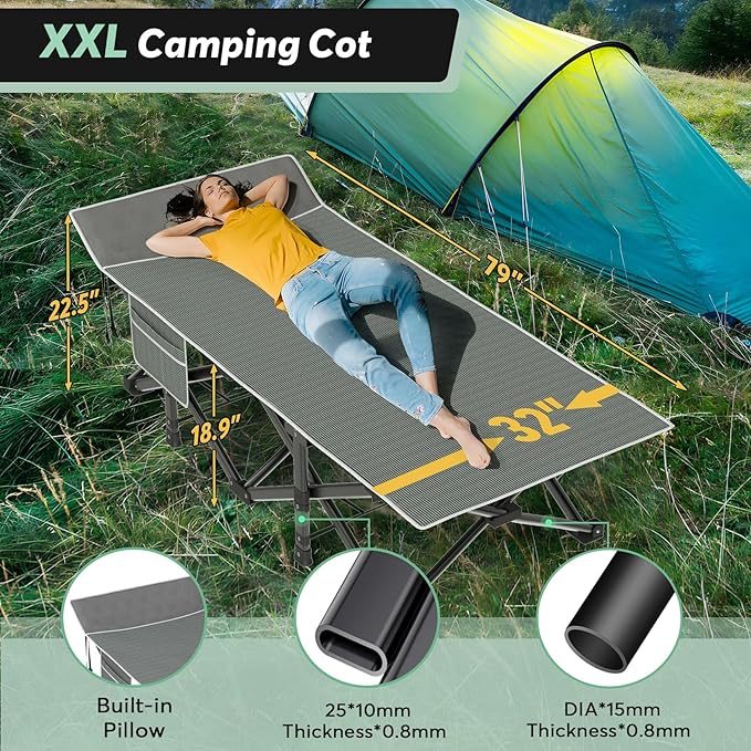 - Portable & Folding--Camping cots offer the convenience of easy portability, allowing you to set up a comfortable sleeping space anywhere you go, lightweight(23.3 lbs), foldable, come with Oxford bag for hassle-free transportation. Say goodbye to uncomfortable sleeping arrangements on the ground.