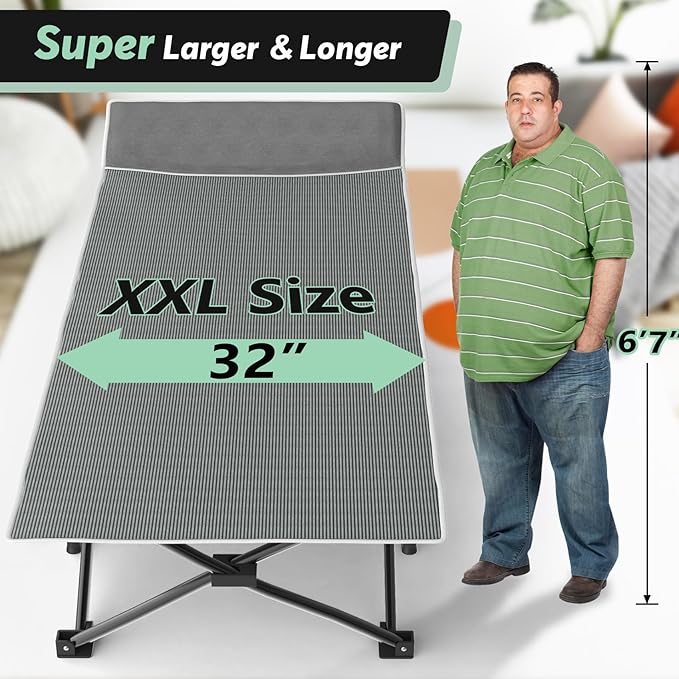 Slendor Oversized XXL Camping Cot, Folding Cot for Adults, 79" L x 32" W x 19" H Sleeping Cot with Mattress, Carry Bag, Camp Cot Bed for Travel, Guest, Support 500lbs, Stripe Grey Cot+ Grey Pad