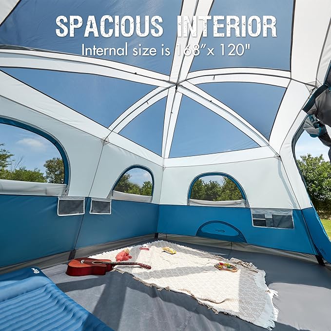 - Good Vlentilation & View: To enhance airflow, this big tent has 2 large doors, 6 mesh windows, 2 ground vents, and 1 mesh ceiling that allow fresh air and a warm breeze to flow in and out quickly. Moreover, you are also able to enjoy a wide view of the stars while lying in bed with your family at night.