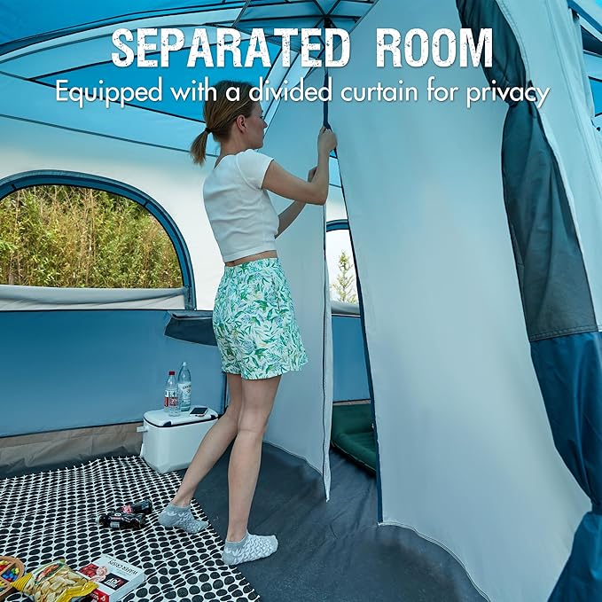 - 2 Room & Divider Curtain: A partition curtain can be hung from the ceiling of the tent to divide the large tent into 2 rooms with separate doors for increased privacy.
