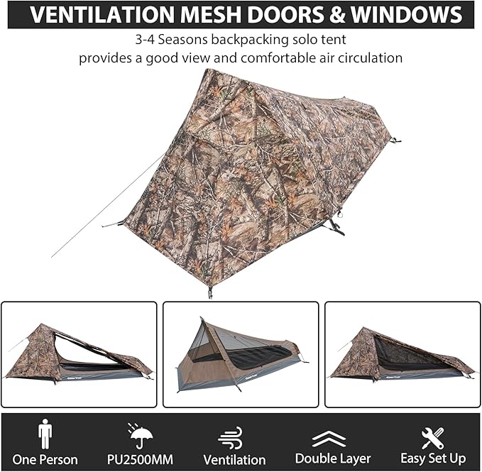 - 【Reliable 1 Person Tent】Crafted from 210T ripstop PU2500mm polyester fabric and lightweight yet durable aluminum poles, the bivy tent is built to withstand the elements. It provides year-round protection from UV rays, waterproof, making it a reliable choice for outdoor adventures - Camping, hiking , motocycling, backpacking, hunting etc.