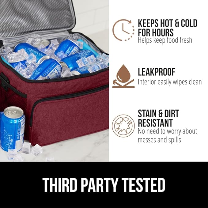 GORILLA GRIP Reusable Insulated Lunch Box Bag for Women Men, Large Leakproof Soft Cooler Bags, Multiple Compartments, Mesh Pockets, Adjustable Strap, Food Tote Keeps Drinks Cold, 8L, 10x9, Burgundy