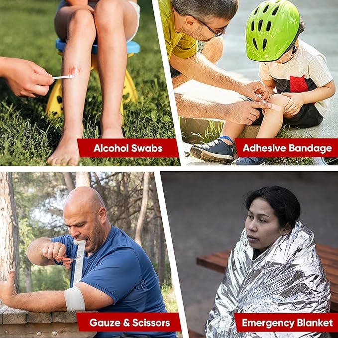 - [COMPACT & COMPREHENSIVE] PTEROMY 150PCS Small first aid kit covers essential supplies for daily emergencies, including adhesive band-aids, burn dressings, wipes, tourniquets, emergency blankets, scissors, safety pins, triangular bandages and more. Whether for daily use or outdoor activities, it provides ample supply for minor cuts, burns, bruises, and other incidents.