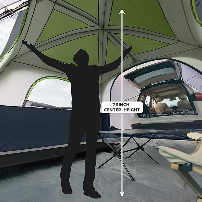 - Roomy 6 People SUV Tent: Accommodate the whole family with our spacious tent that comfortably fits 6 people, measuring 10' x 9' x 78" (H) with enough room for 2 air mattresses or 6 sleeping bags, and a center height of 78" for easy standing and changing