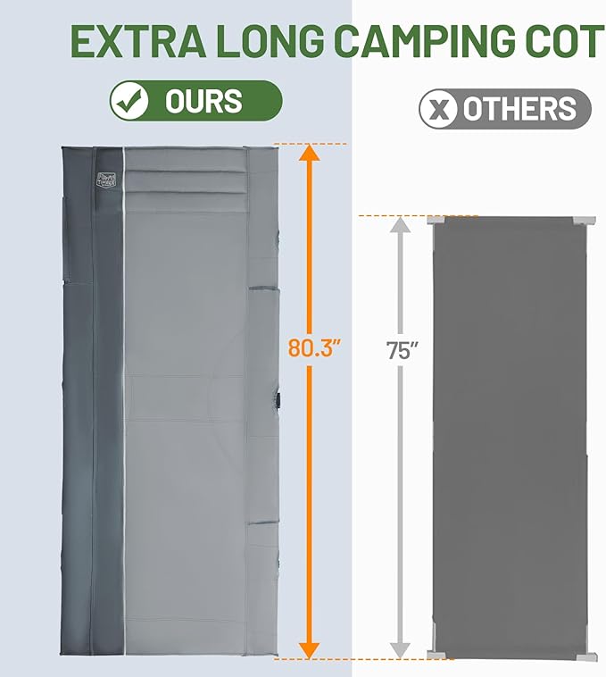 - Extra Wide Folding Cot: Featured with 31.8in width, the cot for sleeping is much wider than usual and optimal for all. You can feel free to turn over on the cot. 17.3in off the ground keeps you from the moisture.