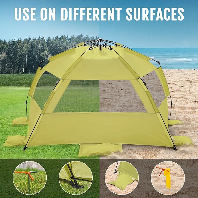 - Easy Set Up with Stability Accessories & Easy to Carry - Quick popping mechanism allows to set up in seconds! Includes 5 attached sandbags, 6 steel stakes, 6 sand stakes & tiedown strings to provide more stability; lightweight and easy to fold back with a compact carrying bag for easy transport and storage.