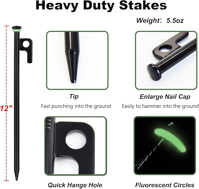 - 【Value Tent Stake Kit】Package come with 32pcs of 12in metal tent stakes(Diameter 3/8", weight 5.4oz), 32pcs fluorescent rubber rings, 1pc storage pouch.