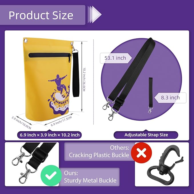 - LIGHTWEIGHT & LARGE CAPACITY: Weighs only 0.3 lb, this drybag is spacious enough to hold all your essentials such as swimsuits, goggles, a mini camera, watch, wallet, cell phone, sunglasses, keys, lipstick, and a few other small items.