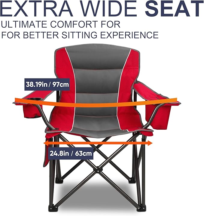 Colorsoul Oversized Folding Camping Chair, Outdoor Padded Camping Chair Support 300 LBS with Cup Holder and Cooler Bag, Portable Lawn Chair for Beach Picnic Sports, (Red)