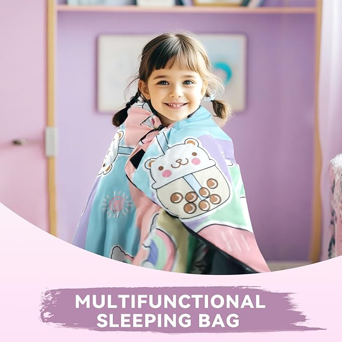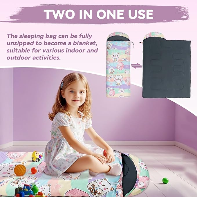 - CAMP IN COMFORT FOR KIDS: Our camping sleeping bags are exquisitely designed with vivid colors. The pink sleeping bag is especially designed as a girls sleeping bag.The compact sleeping bag adopted a hood design. The hood provides additional support and warmth to a child's head. There are drawstrings on the hood, allowing your child to tighten it and stay warm. The children's sleeping bag is equipped with a firm touch fastener, so there is no need to worry about accidental unzipping at night