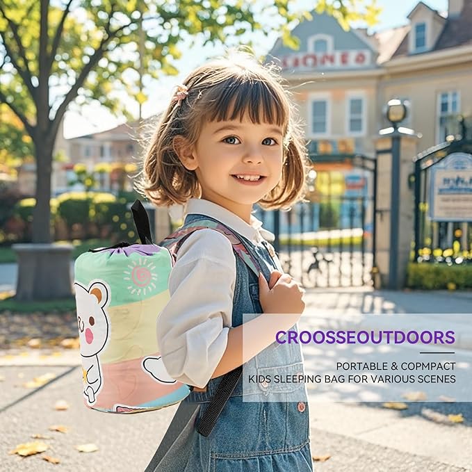 - LIGHTWEIGHT AND COMPACT: Croosseoutdoors outdoor sleeping bags weigh only 2.44lbs, unfold to 66.93” x 25.59”. Just fold it in half and then roll it up, and it can be packed into a backpack measuring 14.96” x 11.81”. The double carrying straps of the teen sleeping bag are meticulously designed with a significantly widened construction to make it more comfortable for your child when carrying the sleeping bag on their back. It's the perfect companion for your child on outdoor adventures or camping