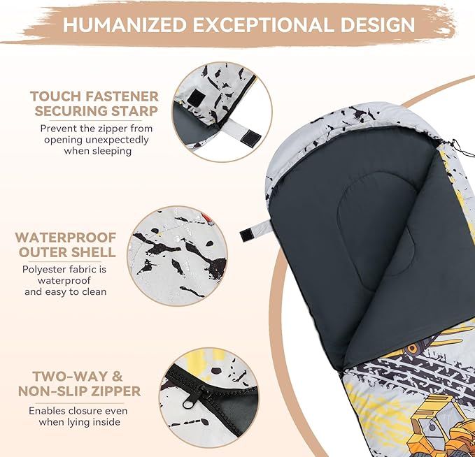 - SELECTED MATERIALS: The 3 season youth sleeping bag is made of polyester fabric, which is tear - resistant, waterproof, and easy to clean. Even if there are stains on its surface, they can be gently wiped off with a towel. The soft lining is filled with 350GSM hollow fibers and features Double S-stitched seams for maximum warmth and insulation