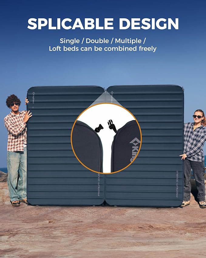 - ULTIMATE COMFORT WITH 3D SIDE WALLS & LARGE FOAM CHAMBERS: The KingCamp double sleeping pad features 3D side walls and a high-end, hole-punched foam design that enhances comfort and reduces weight. The oversized foam chambers provide superior support and cushioning, while the unique design minimizes noise when you shift during the night, ensuring a peaceful sleep.