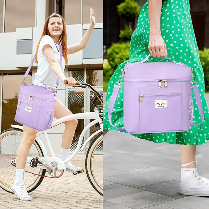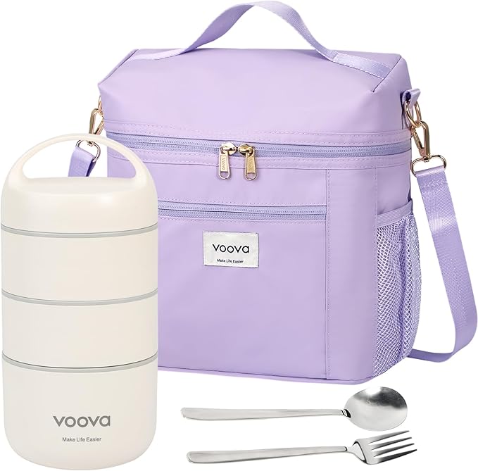 Voova Stackable Stainless Steel Thermal Lunch Box with Lunch Bag and Cultery Set for Adult Women Men, 3 Tier Leakproof All-in-One Insulated Bento Boxes Food Container for Work, Purple