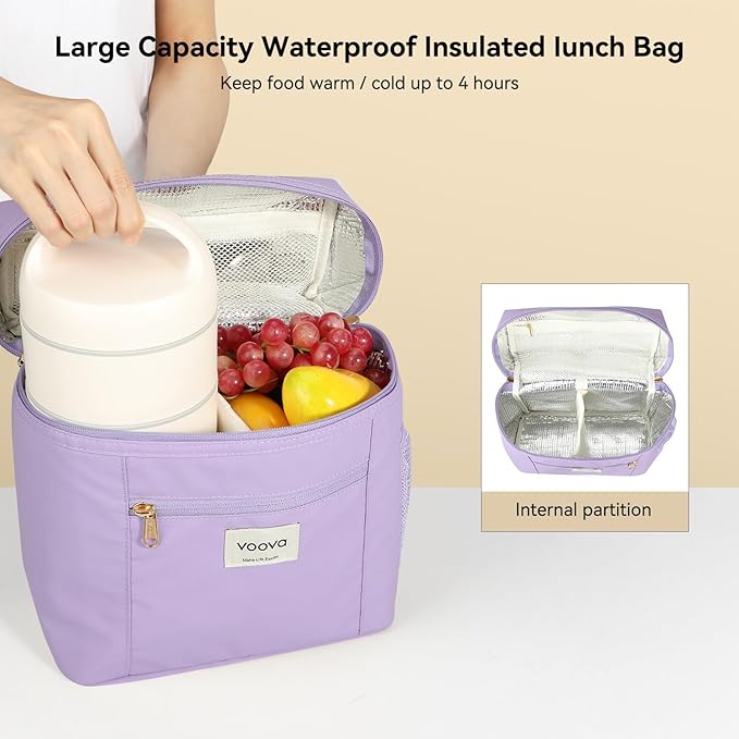 - Includes Lunch Bag & Cutlery : Our lunch box containers comes with a large capacity insulated lunch bag and sturdy stainless steel 304 cutlery. The insulated cooler bag is made of high-quality insulation material, which can effectively maintain the warm or cold state of the food in the lunch box for 3-4 hours. The purple lunch bag has a large space, allowing you to put some fruits or drinks inside, and the small pocket outside can also hold small items such as keys and tissues.