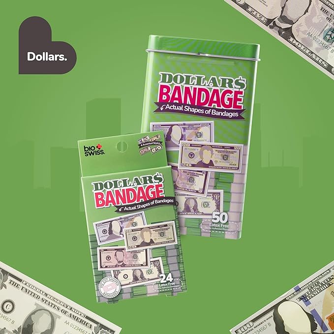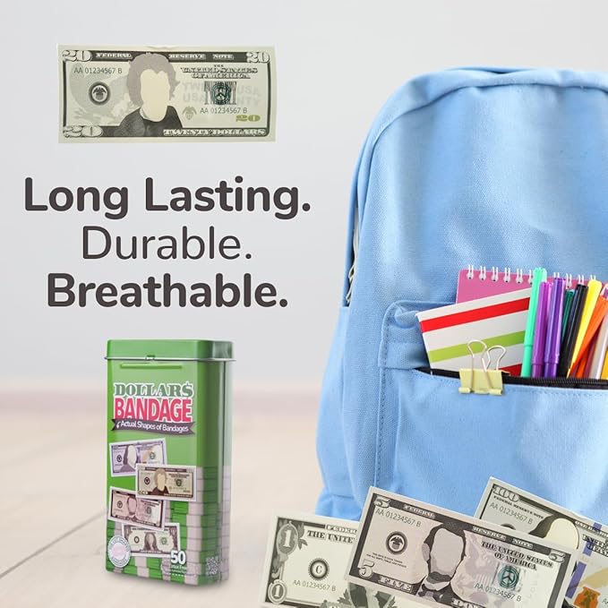 - MONEY BANDAGES: This 50 piece pack of adorable dollar bill shaped bandages is great for putting a smile on kids' faces while protecting wounds such as cuts, scrapes, and burns; sticky bandages are perfect for kids and adults alike, and also for school nurses and pediatric doctors