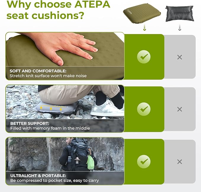 ATEPA Inflatable Stadium Seat Cushion, Self-Inflating Memory Foam Stadium Seats Camping Accessories Chair Pad for Outdoor Airplane Travel Bleacher Patio Backpacking