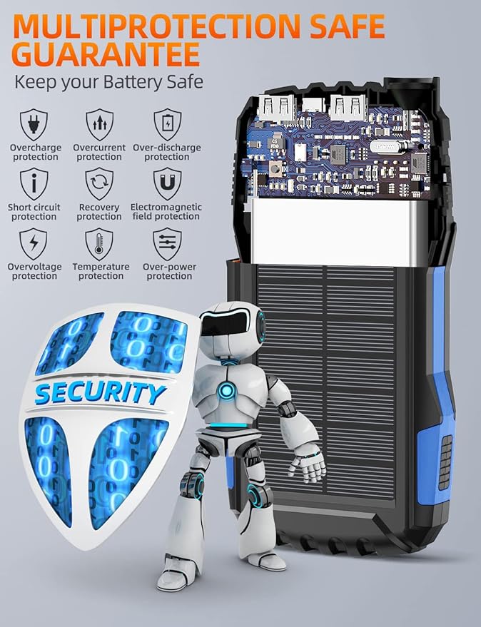 - Solar power bank portable charger uses strong professional ABS material, Chemical resistant, heat-resistant, and has super surface hardness, high elasticity and toughness. IP67 waterproof,drop-proof and dust-proof, so you no longer worry about damage caused by water/drop, the powerbank can work in extreme environments.