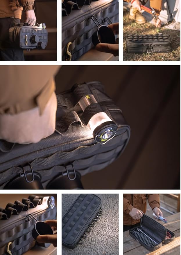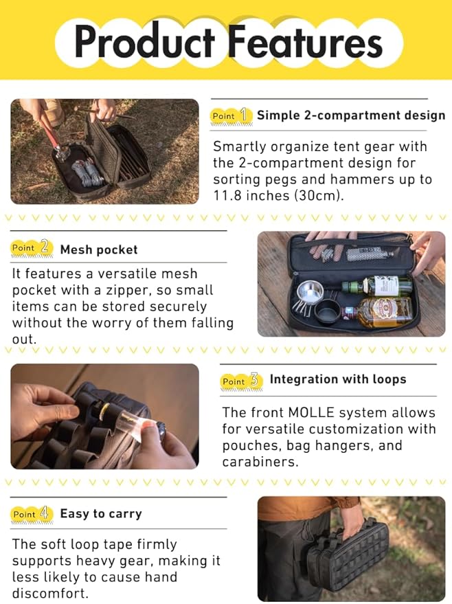 • 【Simple 2-compartment design】When you unzip it, a partitioned mesh pocket is revealed. The zipper opens wide for easy access to your pegs. The front features a military MOLLE system, allowing you to attach carabiners for versatile usage. You can use it in many different ways.