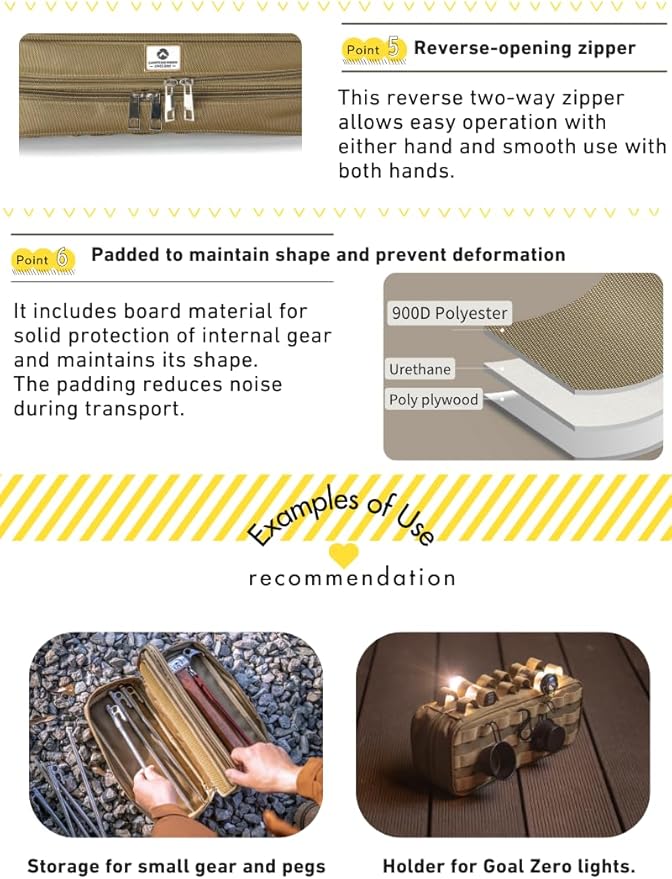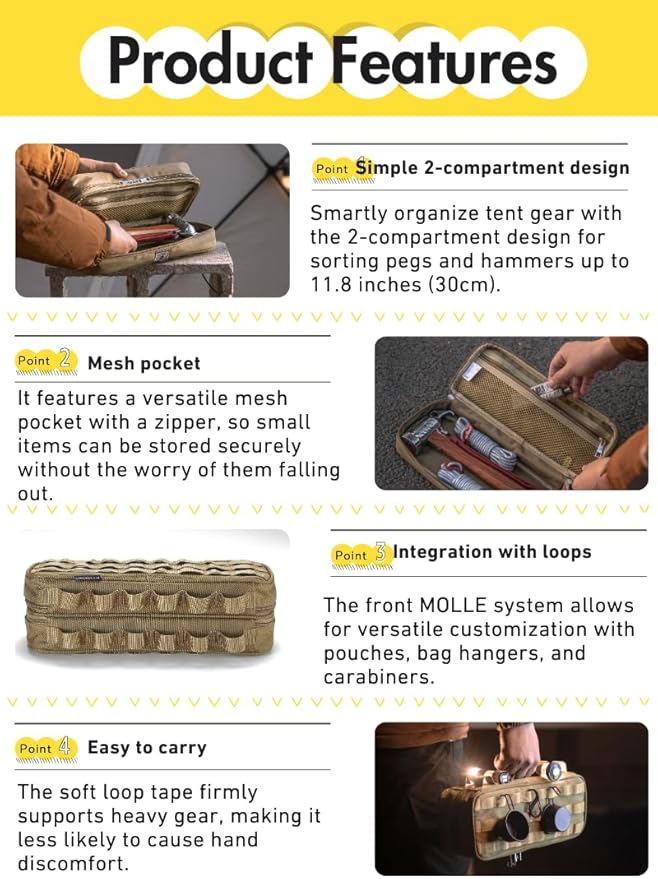• When you unzip it, a partitioned mesh pocket is revealed. The zipper opens wide for easy access to your pegs. The front features a military MOLLE system, allowing you to attach carabiners for versatile usage. You can use it in many different ways!