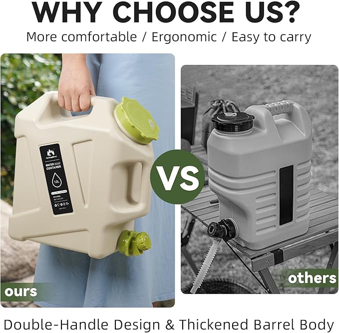 - 【LEAK-PROOF Lid & Water Spigot】Our Camping Water Storage has has a sealing cover and leak-proof faucet that ensures safe storage and easy transportation, without worrying about leaks or spills while in use. It a unique faucet design and 2 extension spigot. Compared to other containers, you don't have to struggle to unscrew the lid, you can dispense water with a simple knob and control the water volume. The extension pipe can be stored in the grooves of the barrel body making storage more convenient.