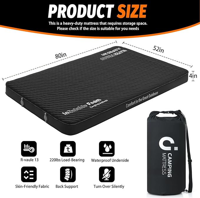 - New Extra Thick Foam Camping Mattress: Measuring 79"x 52"x 4" (double size), most camping mattress on the market are about 3“ thick, this extra thick mattress is made with 4" of foam to keep you off the ground. The highly resilient, high-tech foam distributes weight evenly across the different contact points of the sleeping pad, creating an incredibly soft and supportive surface. Ideal for side sleepers, it can hold up to 800 pounds to ensure maximum comfort for a good night's sleep.