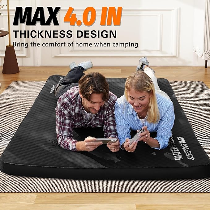 CYMULA Self Inflating Double Sleeping Pad, 4in Ultra-Thick Foam Camping Mattress 2 Person with Air Pump Sack,Camping Beds for Adults Inflatable Sleeping Mat Camping Essentials for Travel, Tent, Black