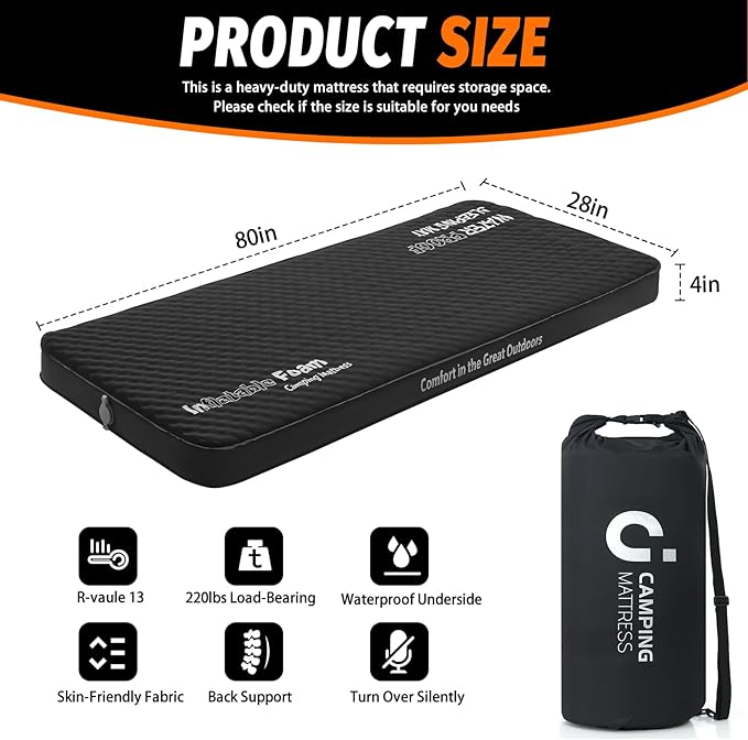 - New Extra Thick Foam Camping Mattress: Measuring 79"x 28"x 4" (single size), most camping mattress on the market are about 3“ thick, this extra thick mattress is made with 4" of foam to keep you off the ground. The highly resilient, high-tech foam distributes weight evenly across the different contact points of the sleeping pad, creating an incredibly soft and supportive surface. Ideal for side sleepers, it can hold up to 800 pounds to ensure maximum comfort for a good night's sleep.
