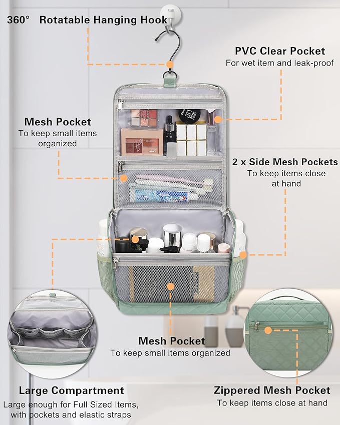 - 360° Rotatable Hanging Hook: The toiletry bag for men with a 360° swivel non-slip metal hanging hook for versatile hanging options. It is big enough to allow you to hang it up on the bathroom, door, closet rod, towel rack, coat hook, door knob, etc.