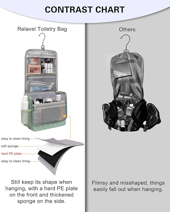 - Unique Design: Relavel toiletry bag has a unique design with a hard PE plate of the main compartment, keeps its shape when hanging, does not worry about dropping things, easy access to the items. More convenient and practical than the same type of toiletry bag on the market. Fully open design that gives you a comprehensive glimpse of your stuff.