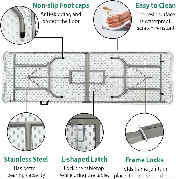 - 【Heavy Duty Table Top】The JingPieCle high-quality HDPE table top can bear 309 lbs,it is 20% thicker than other cheap 8 foot folding tables. the table top is waterproof and stain-proof, you can easily wipe it clean.