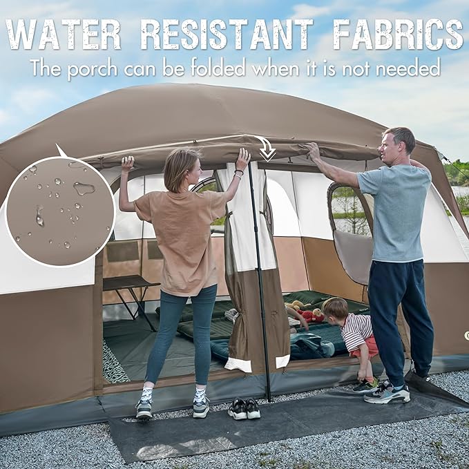 - WEATHER-READY DESIGN: Built with a PU-coated waterproof exterior, durable fiberglass and steel poles, and fully taped seams, this tent ensures reliable rain and wind protection. A rainfly and fabric-covered zippers add extra security