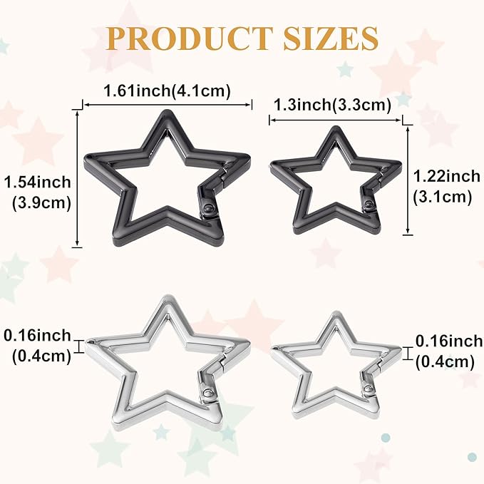 - Package Contains: You will receive 4 pcs zinc alloy star shaped carabiner in 2 sizes and 2 colors. The width is 1.61 in (4.1 cm), 1.3 in (3.3 cm), the length is 1.54 in (3.9 cm), 1.22 in (3.1 cm) and the thickness is 0.16 inch (0.4 cm)