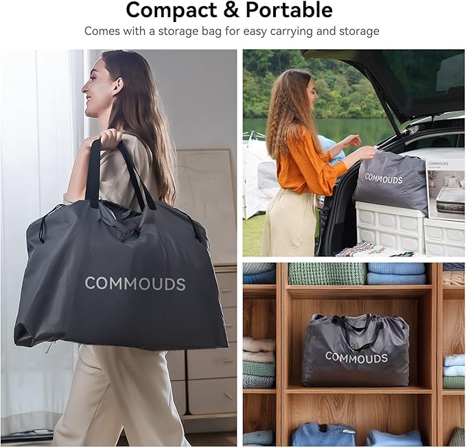 - Removable & Rechargeable Pump for Versatile Use: Equipped with a built-in 2000mAh rechargeable lithium battery pump, COMMOUDS air mattress inflates and deflates effortlessly without power source, making it perfect for for indoor and outdoor activities, like camping, guest stays and portable travel needs