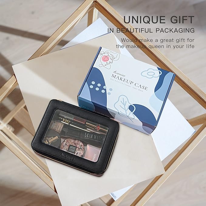 - ❤【LUXURY DESIGN】Measuring 9'' x 6.5'' x 3''(23cm x16.5cm x 7.8cm) in large and 7.9'' x 5.7'' x 2.7'' in small, our makeup bag is sleek and stylish, this makeup travel organizer was designed in a minimalist boxy shape and a cool black color. Crafted in beautiful PU leather and finished with polished hardware, it's the clear pouch you'd be happy with sitting out on display beside you.