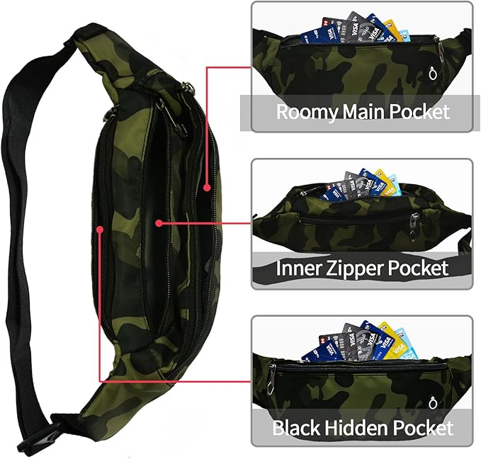 • 【Fanny Pack with 3 Zippered Compartments】Include main pocket,front pocket and back pocket. (1)Main pocket can easily hold your most needed items such as purse, keys and other items. (2) Front pocket can easily carry your phone, because it is large and seperate. (3)On the back side is great for you to keep your valuables away from the thieves.